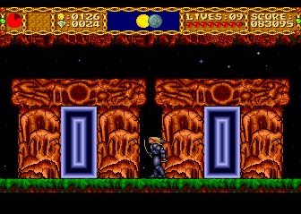 This section of the game has nothing to do with the Ring of Five. Use it to get used to the controls and to save up some cash. Your first goal should be to save up money for the bow. You should have 40 gold pieces upon leaving the town; you'll need 150 to buy the bow.The first section of the forest shouldn't pose much of a challenge. There are three types of enemies in this section. There are spiders that drop down in vertical lines and hang by threads, waiting for you, while there are others that are low to the ground and crawl towards you. The guys that hang are easy to dispose of--just give them a good whack with your axe. One of them should drop a gem after it's killed. You should kill the guys that are low to the ground by ducking and kicking them. These guys drop lots of money; be sure to grab each gold piece before it vanishes. Be wary of these little guys, though; they'll occasionally fire shots at you. The third type of enemy is a flying creature that is extremely pesky. Try to hack it while it's flying towards you. If you miss it, it'll fly around you in circles until you kill it. Just duck and keep kicking until you get it. Don't worry if you get hit a few times; these pests don't do much damage at all. If you find yourself running low on energy at any point in the forest, head back to town and save, and wait for an eclipse to heal you. You should save your progress at regular intervals anyway.